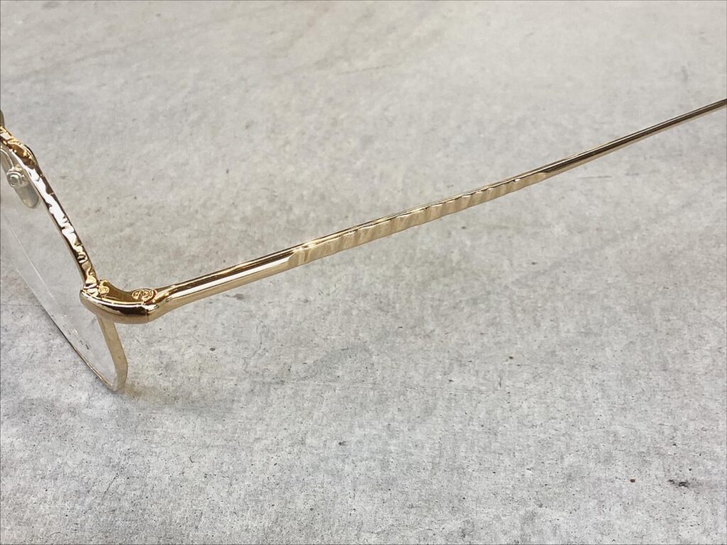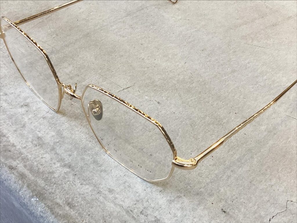 フロントリム周りやテンプルはハンドハンマーで凹凸を付ける技法で質感をUP