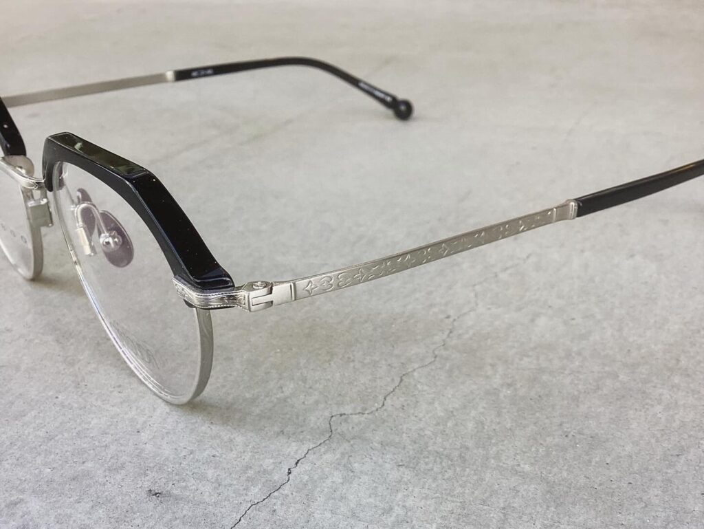 ブリッジやリム周り、テンプルに至るまで細やかな彫金がさりげなく施され、質感を爆上げでございます